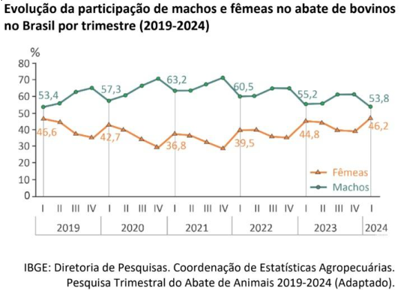 Com relação à exportação de carnes, os gráficos a seguir apresentam a evolução do abate de bovinos e da participação de machos e fêmeas, por trimestre (indicado por algarismo romano), segundo informações